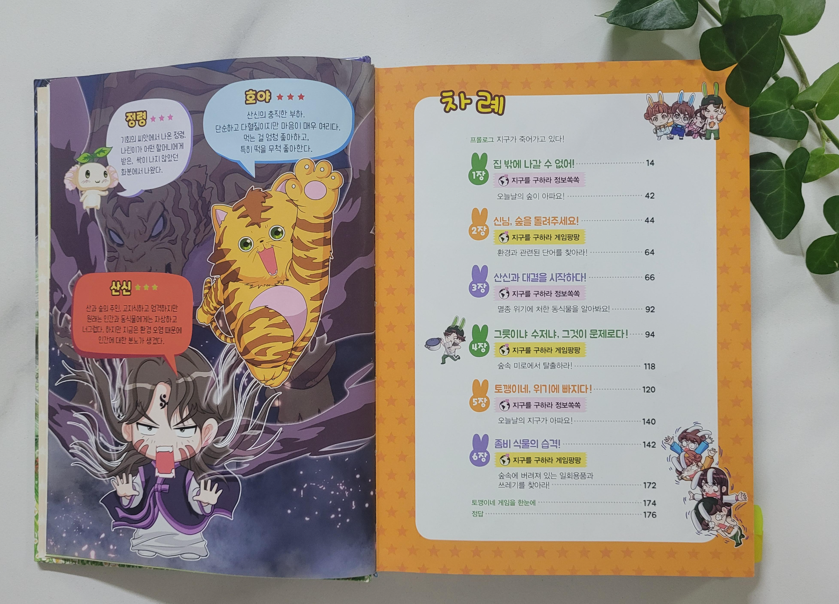 차례를 보니 정말 다양한 내용을 담고 있어요. 집밖에 나갈 수 없는 이유와 신님께 숲을 돌려달라고 애원하는 모습은 어떻게 담겨있을까요? 산신과 대결을 통해 지구를 구합니다. 미로 탈출도 하고 빈칸 글도 채우고 쓰레기를 찾아보고 즐거운 게임들이 가득 담겨 있어요. 보드게임과 같은 내용을 담기도 했지만 지구의 정보들이 쏙쏙 들어 있어요.